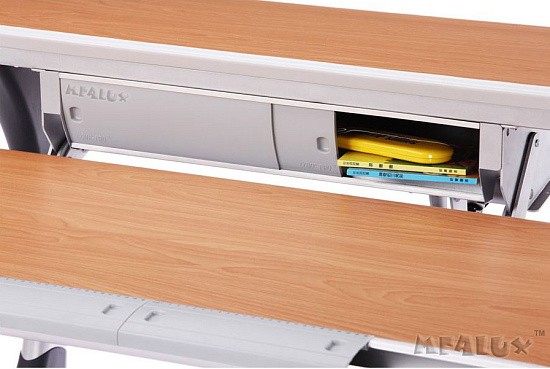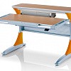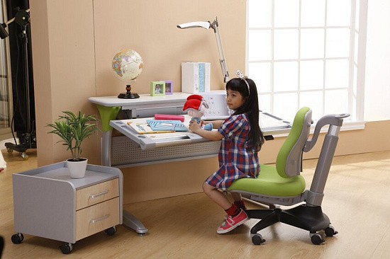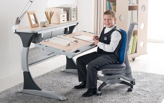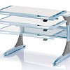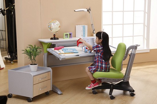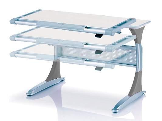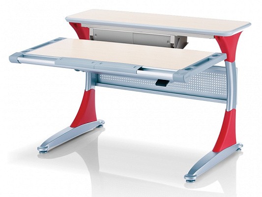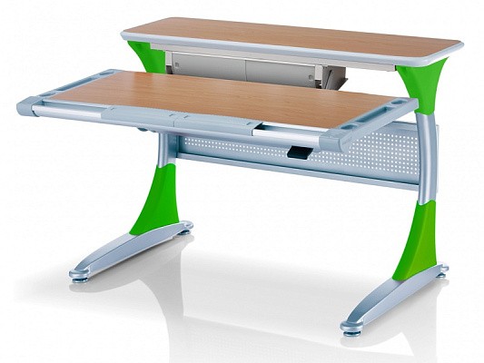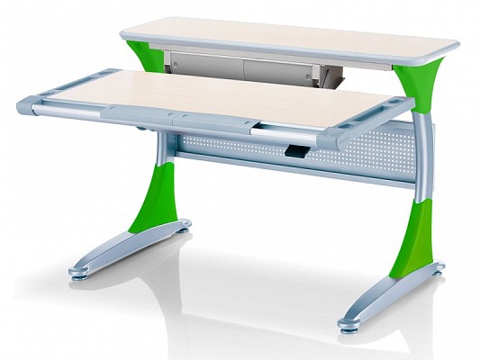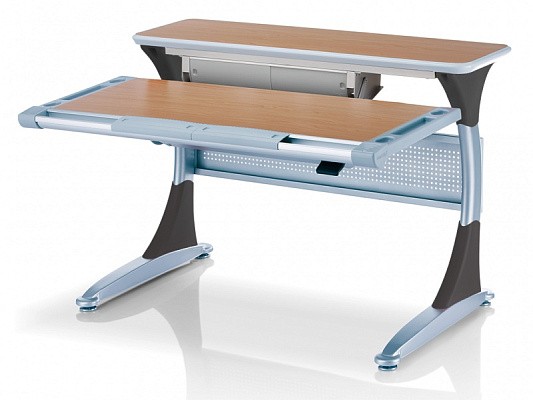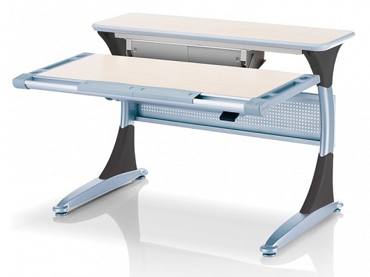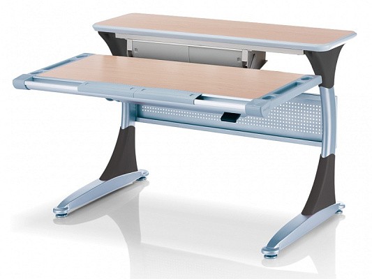 Удобная задняя полка-приставка и подвесной двухсекционный ящик создают легкодоступную зону хранения школьных учебников, тетрадей и принадлежностей. Впрочем, места с избытком хватит даже для установки монитора компьютера. Все расположенные на полке вещи никак не будут мешать изменению угла наклона столешницы или её высоты.