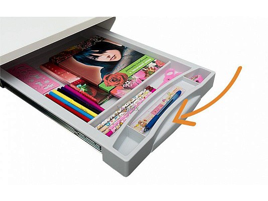Выдвижной органайзер с разделителями позволяет хранить в идеальном порядке канцтовары и школьные принадлежности.