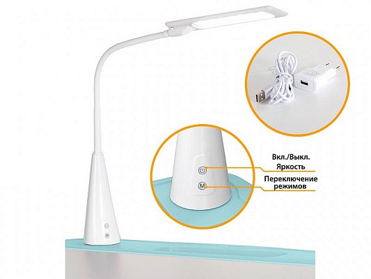 На сенсорной панели лампы размещена регулировка яркости и переключения трех режимов свечения (Для чтения, для письма и ночной). Прорезиненная рукоять позволяет легко менять угол наклона.