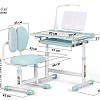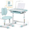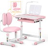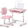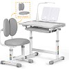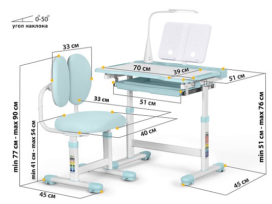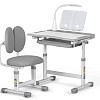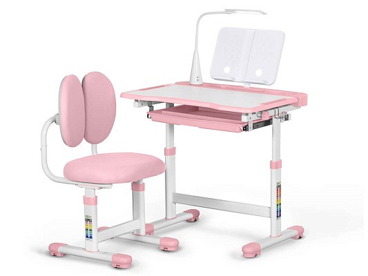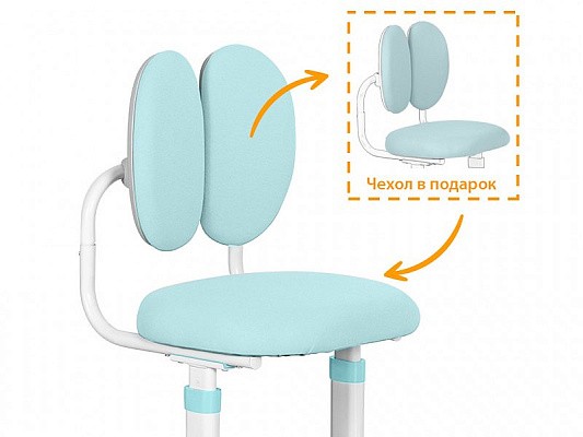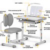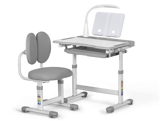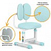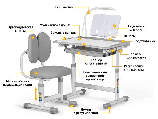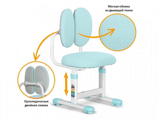 Особого внимания заслуживает кресло из комплекта, которое оббито качественной дышащей мебельной тканью. Двойная ортопедическая спинка обеспечивает распределение нагрузки на спину ребенка. Ступенчато меняется высота стульчика в диапазоне 41-54 см, а глубина составляет 33 см. Массивные металлические ножки оснащены мебельными опорами. Максимальная нагрузка на кресло – 60 кг.
