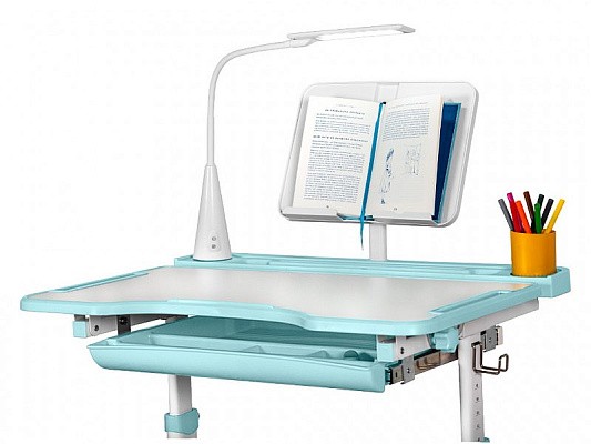 На статичной полочке из прочного и безопасного ABS- пластика встроен небольшой пенал для канцелярии, подстаканник. Также крепится светодиодная лампа и подставка под книгу.