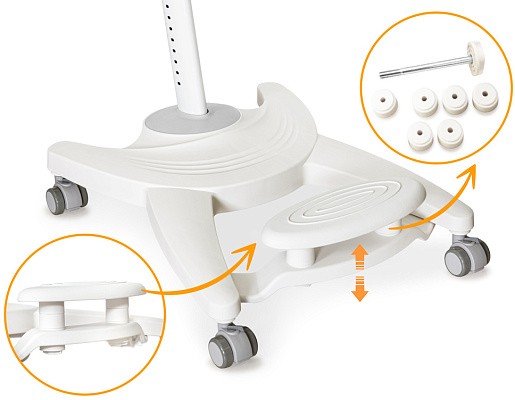 Кресло комплектуется съемной регулируемой подставкой для ног, которая придаст удобства для детей помладше. Подставка из прочного пластика регулируется по высоте. Она обеспечивает упор для ног, когда парта не опускается достаточно низко. Благодаря большому количеству регулировок и регулируемой подставке для ног кресло легко настраивается для детей всех возрастов.