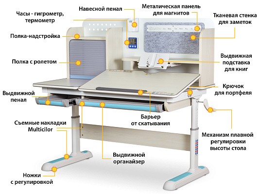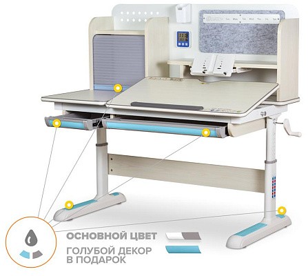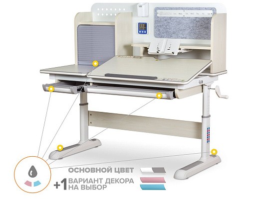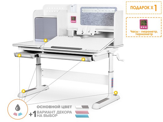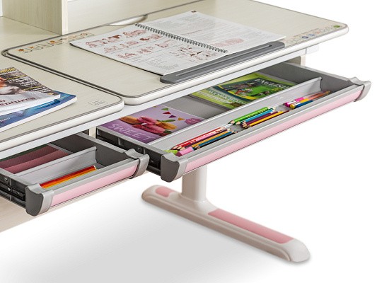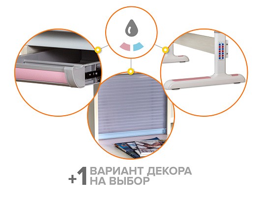 Накладки Multicolor. Важной особенностью данного стола является наличие сменных цветных накладок. Приобретайте стол серого цвета и получите на выбор либо голубые, либо розовые накладки. Кроме того, вы можете сразу приобрести стол только с розовыми, либо только с голубыми накладками в комплекте. Накладки меняются на ножках, выдвижном органайзере, пенале и на нише с подвижным ролетом. Меняйте цвет декора в зависимости от настроения вашего ребенка!
