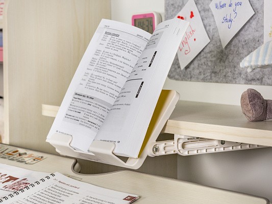 Полка-надстройка дополнена выдвижной подставкой для книги. Подставка меняет угол наклона и легко убирается за ненадобностью внутрь полки.