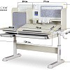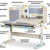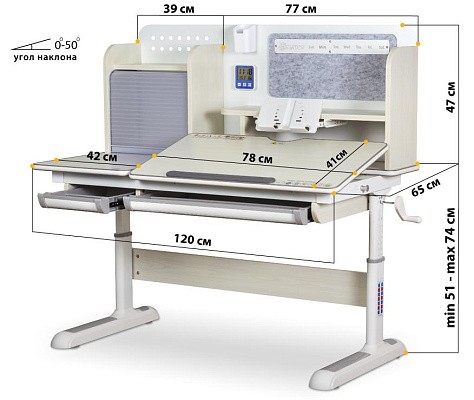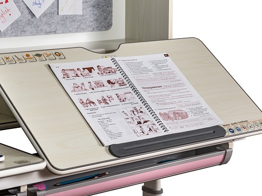 Подвижная часть столешницы легко изменяет угол наклона с помощью специального газлифта от 0 до 50 градусов. Благодаря такому большому диапазону регулировки стол можно использовать не только для чтения и письма, но и для рисования (как мольберт). Безопасный зазор гарантирует, что ребенок не прищемит пальцы, когда захочет самостоятельно изменить угол наклона.