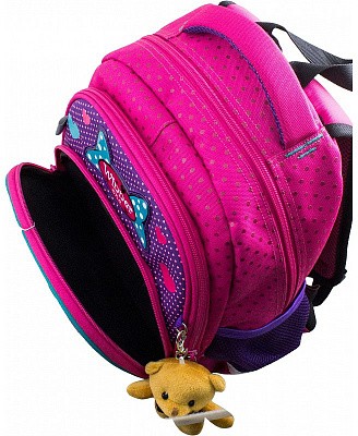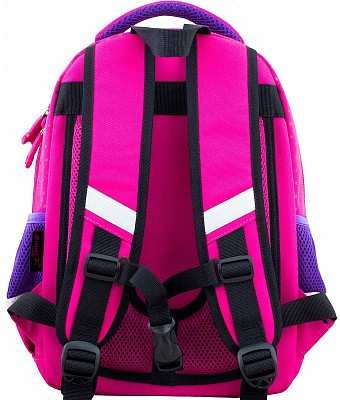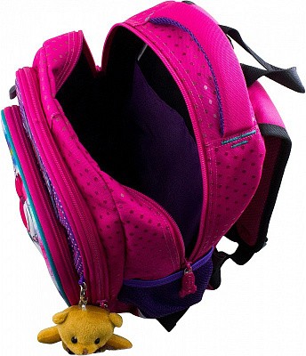 В школьном рюкзаке два основных отделения и карман-органайзер. Основное отделение с 2 двумя разделителями и резинкой для крепления школьных принадлежностей. Второе отделение без наполнения. Спереди вместительный карман на молнии украшенный объёмной 3D картинкой с органайзером для письменных принадлежностей. По бокам карманы-сеточки на резинке.